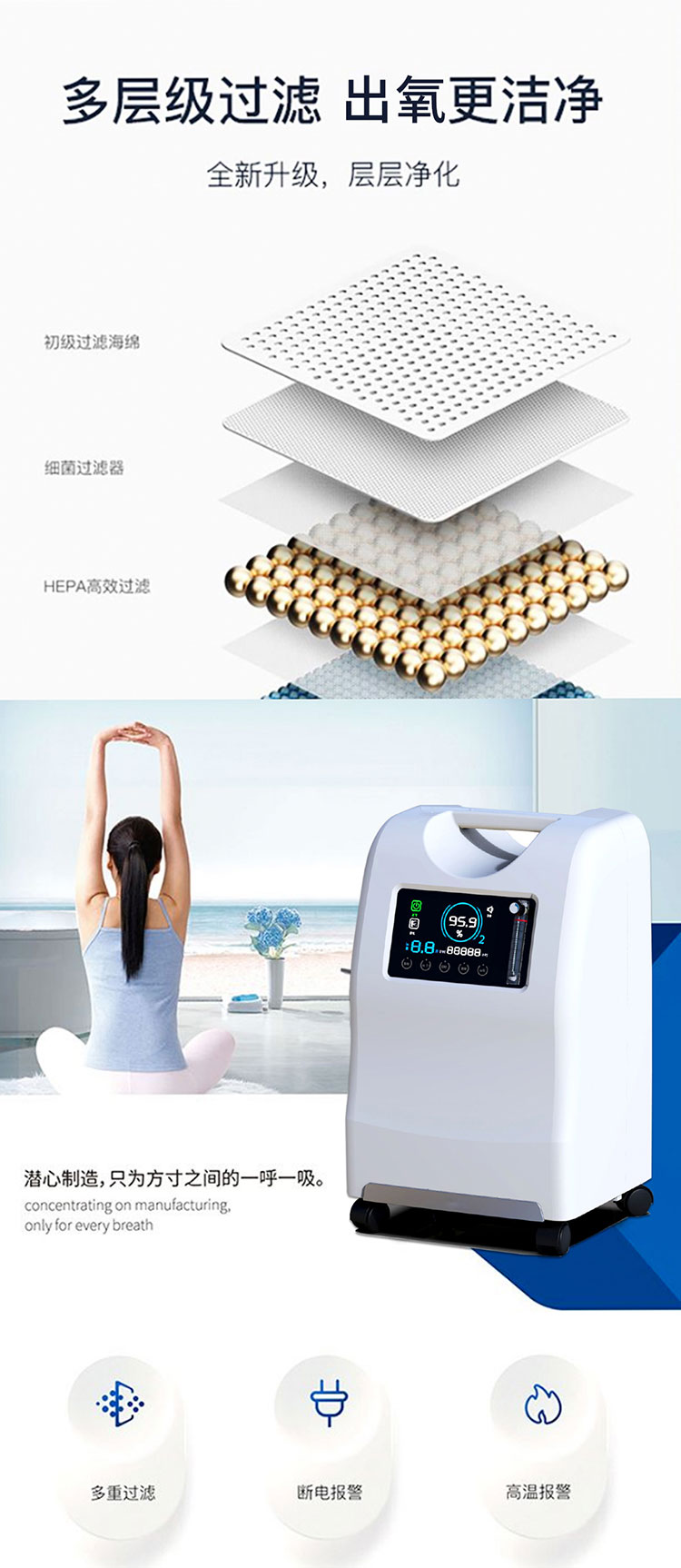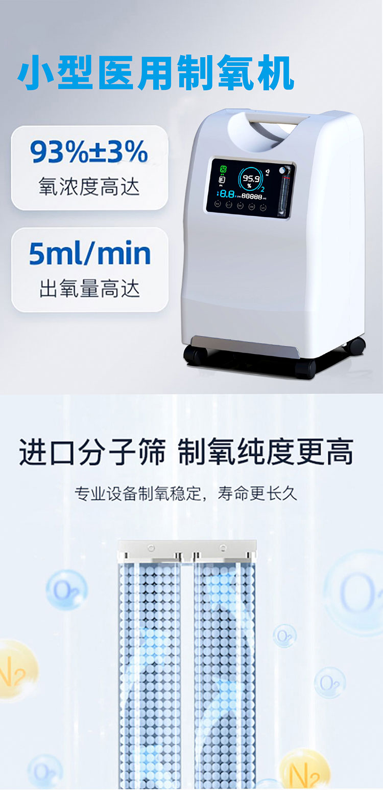 5L小型醫用制氧機:出氧量高達5L/min,制氧純度高,可48小時持續輸出高濃度氧氣,氧濃度高達達93%±3%,超低分貝,適用于老人、孕婦,也適用于白領、商人、學生等需要補氧者。